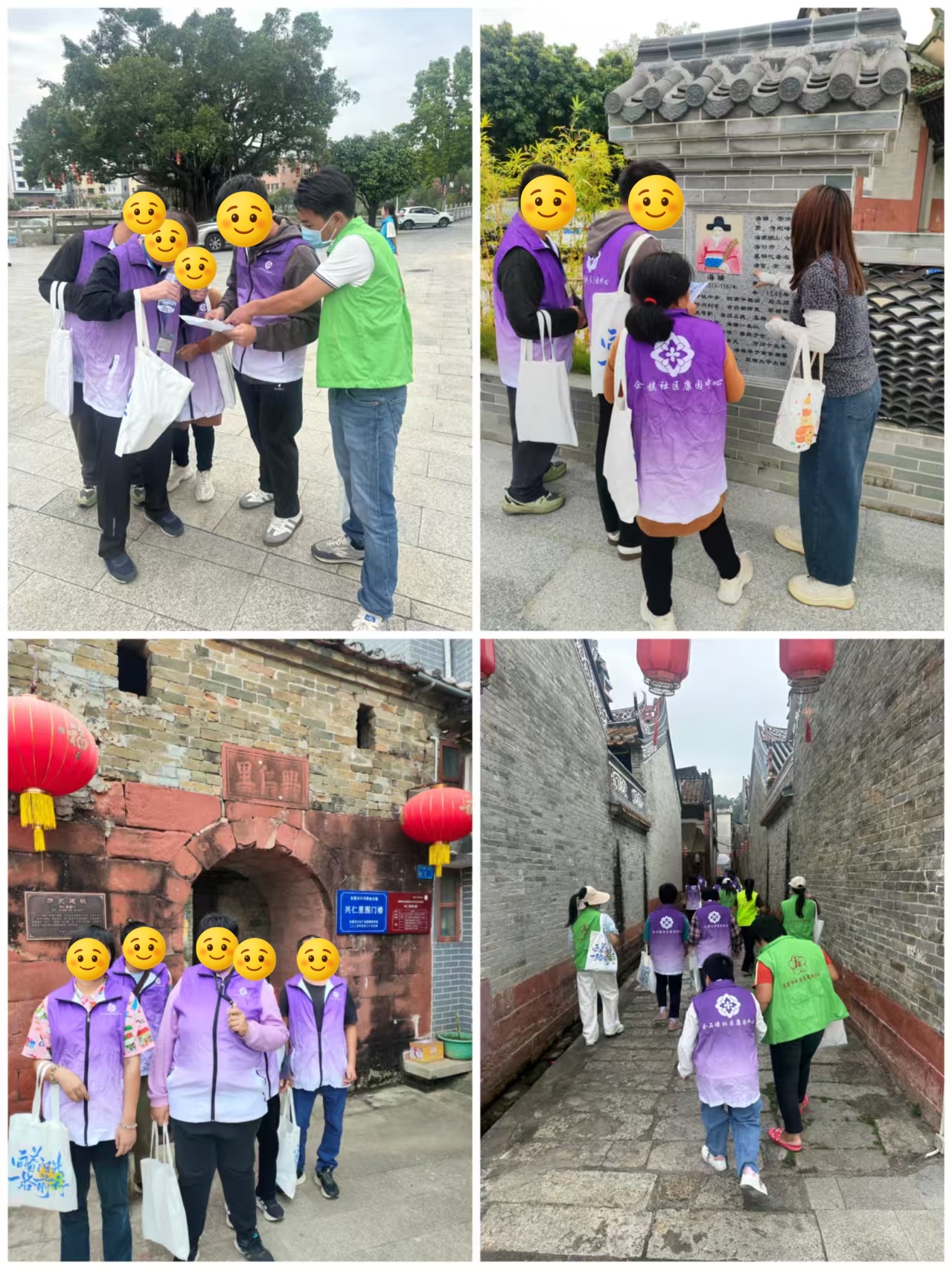 随后,学员们在工作人员和志愿者的引导下有序搭乘公交车前往江边古村落,开启古村落文化探索之旅。活动先介绍了江边古村落的历史文化,让学员在古建筑与民俗故事中感受本土文化的韵味。接着开展“线索地标大合拍”互动游戏,游戏以小组为单位,每组抽取一个任务,根据线索照片寻找对应地点并拍摄小组合影,学员们在探索中加深了对古村落历史文化的了解与记忆。