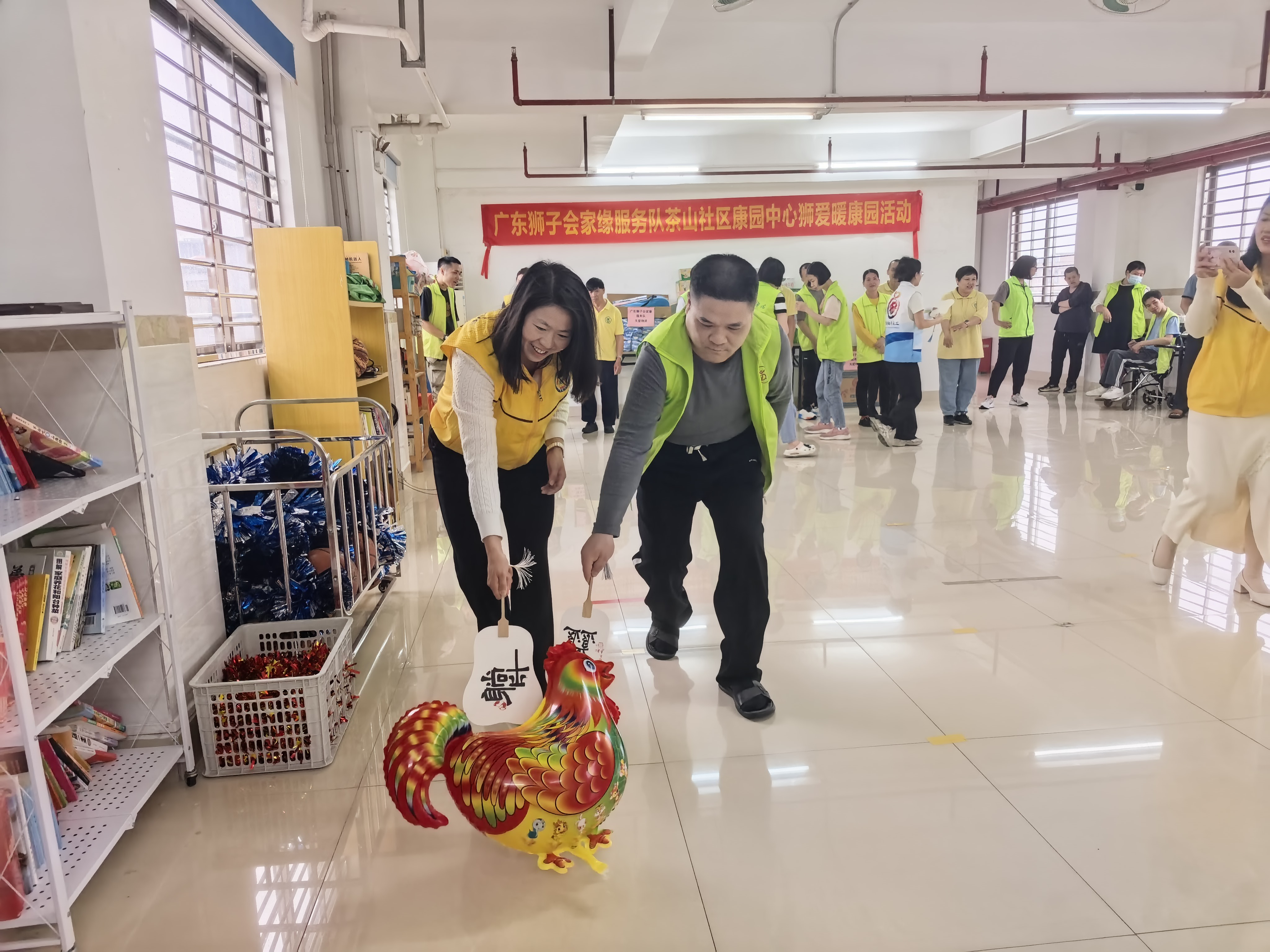 活动中,服务队成员与学员们一同参与了趣味盎然的“扇子赶鸡”游戏。游戏规则简单有趣,两人一组,大家手持扇子将“小鸡”气球赶向指定区域。你追我赶间,现场气氛热烈欢腾,笑声、掌声、加油声此起彼伏。学员们全情投入,在轻松愉快的互动中感受到了陪伴的快乐与温情。