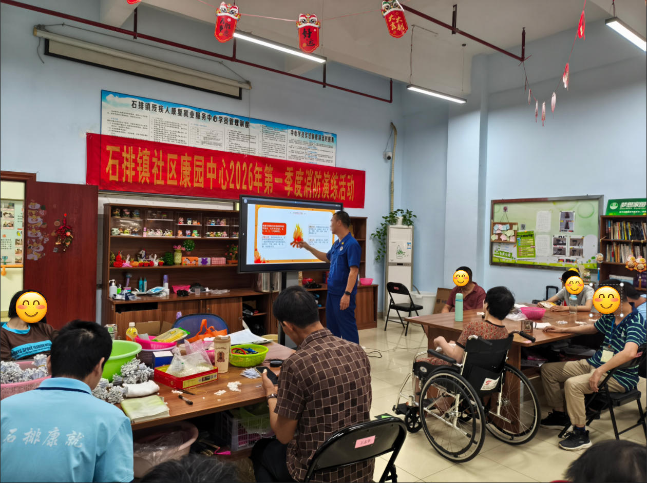 3月31日,石排镇社区康园中心与石排镇消防救援大队联合举办了2026年第一季度消防演练活动。演练通过“理论+实操+排查”相结合的方式,检验应急预案的可行性,提升工作人员及学员在火灾等突发事件中的自救互救与应急处置能力,确保在紧急状况下能够迅速、有序疏散,保障人员生命安全。
