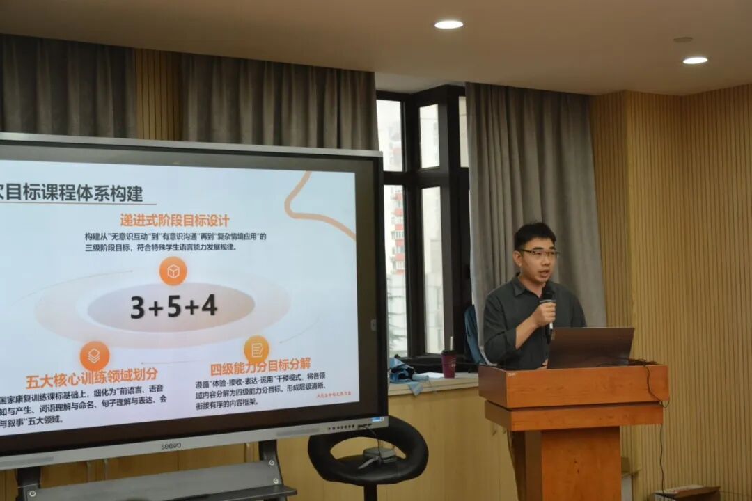 周强老师则聚焦学校特色课程建设,系统阐述了阶梯式“3+5+4”沟通与交往课程体系的构建思路。该体系以“无意识互动”到“有意识沟通”再到“复杂情境应用”为三级递进阶段目标,融合“前语言、语音感知、词语理解、句子表达、会话叙事”5大核心领域,设计“感知-理解-表达-运用”四级分层目标。形成了一套可复制、可推广的特殊儿童语言康复教学模式。两位教师的分享内容赢得了与会专家及同行的一致好评。