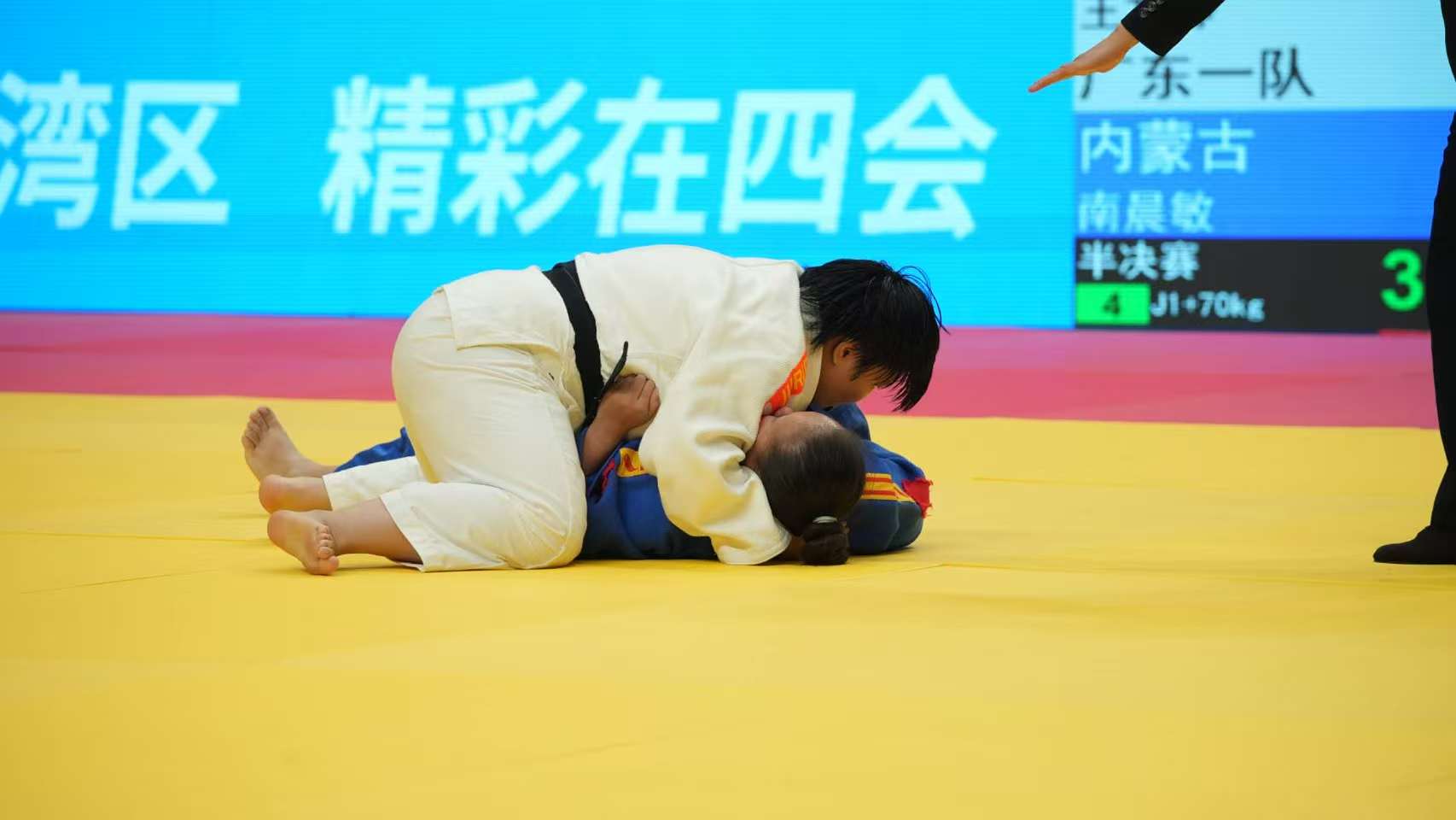 王文静(白色道服)在盲人柔道女子J1+70公斤级赛场上的精彩瞬间