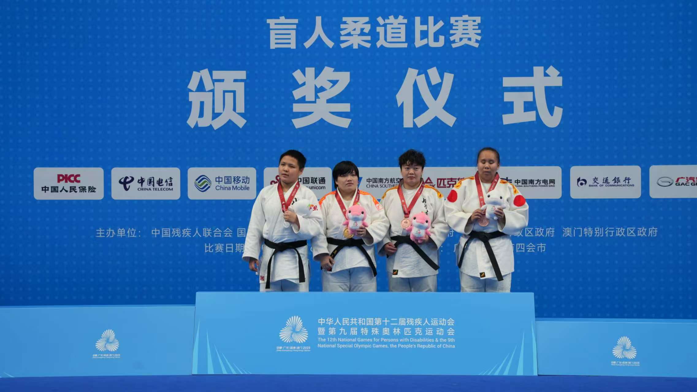 冠军王文静(左二)在盲人柔道女子J1+70公斤级颁奖仪式上